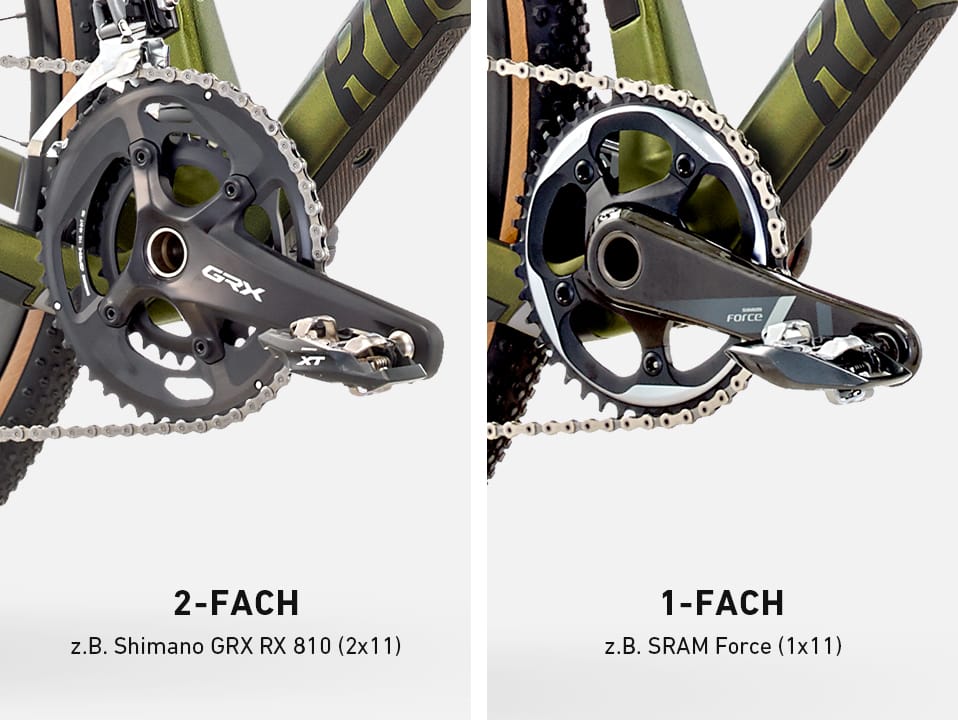 Die verschiedenen Gravel-Schaltgruppen gibt es teilweise mechanisch und elektronisch sowie mit 1-Fach oder 2-Fach Antrieb. Zieht es dich mehr ins Gelände und möchtest du lieber auf schnell wechselnden Höhenmetern unterwegs sein, dann ist ein Bike mit 1-Fach Antrieb genau das richtige für dich. Fährst du gerne Offroad, aber möchtest auf einem längeren, ausdauernden Trip nicht ohne feine Gangabstufungen auskommen, dann ist ein Bike mit 2-Fach Antrieb die richtige Wahl.