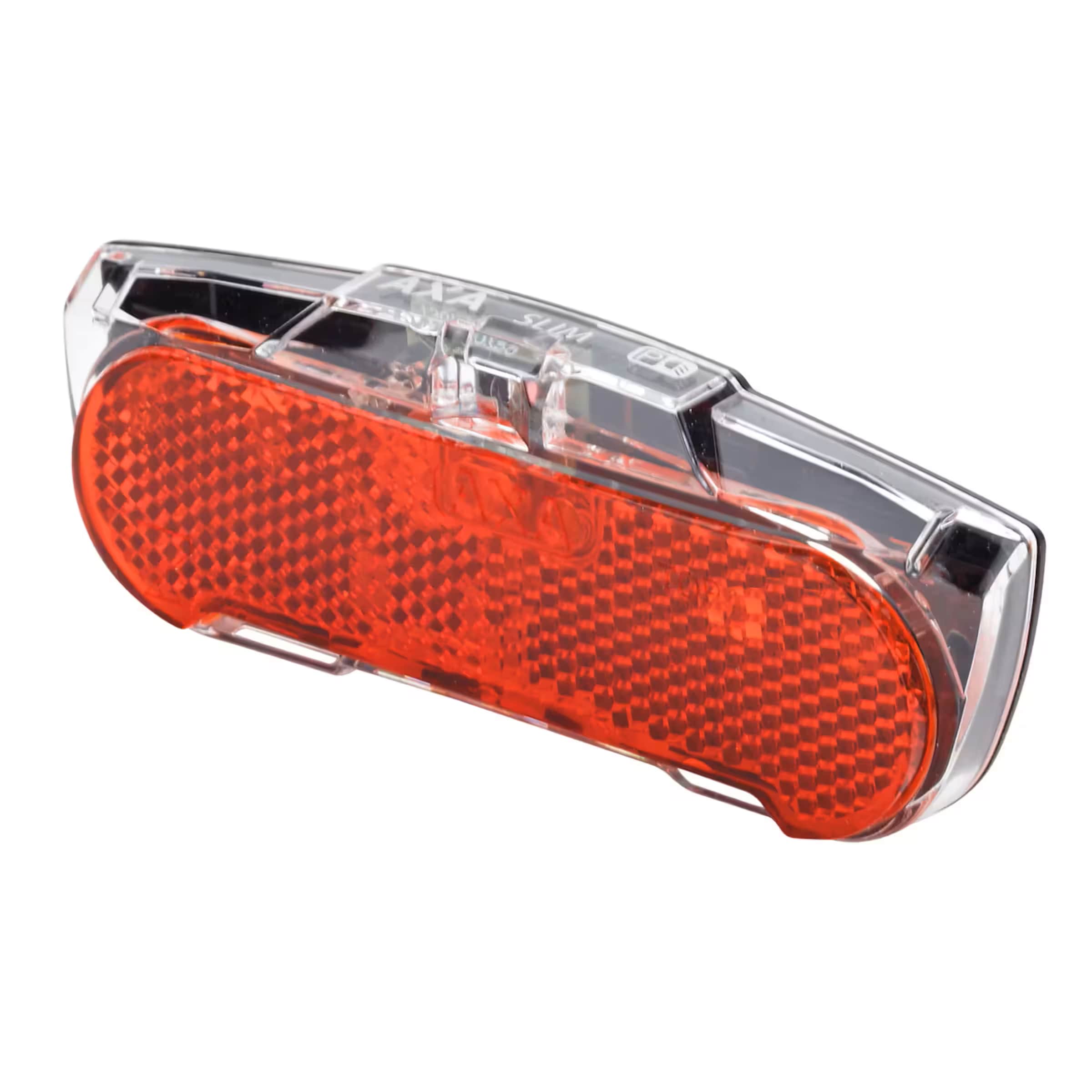 Das AXA Slim Steady Dynamorücklicht überzeugt durch seine schlanke Bauweise und clevere Lichtverteilung. Dank nur ca. 17,5 mm Tiefe bietet es am Gepäckträger kaum Angriffsfläche und sorgt gleichzeitig für gute Sichtbarkeit. Das integrierte Standlicht bleibt bis zu 4 Minuten aktiv, der Rückstrahler erhöht zusätzlich die passive Sicherheit. Die Montage gelingt dank Druckanschlüssen schnell und ohne Kupplung, ein integrierter Überspannungsschutz schützt die Elektronik.
