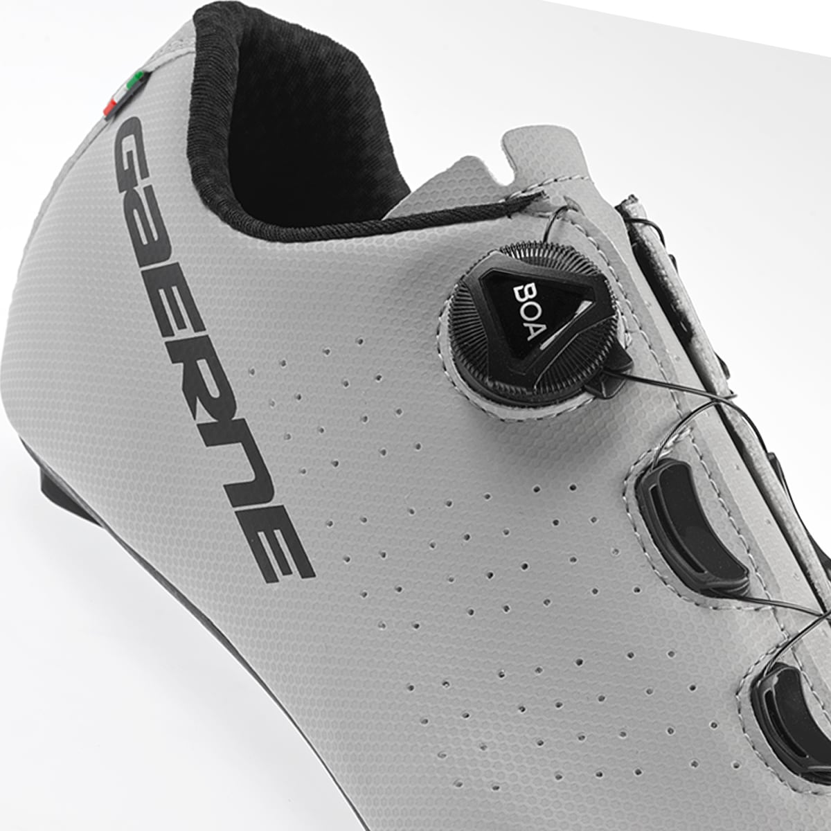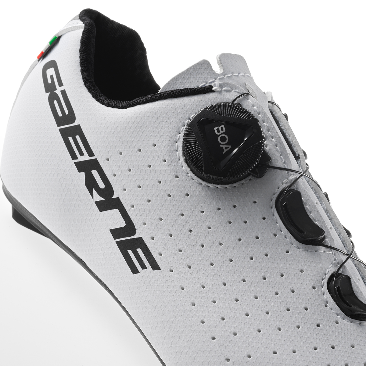 Mit den G.SPRINT Rennradschuhen von GAERNE kannst du dank dem BOA L-6 Drehverschluss problemlos eine millimetergenaue Anpassung auch während der Fahrt durchführen. Die GAERNE EPS CARBON POWER SOLE 8.0 Nylon-Sohle mit Carbon-Anteil sorgt für maximale Kraftübertragung aufs Pedal und bietet dank fünf Belüftungsöffnungen eine gute Ventilation im Schuh.