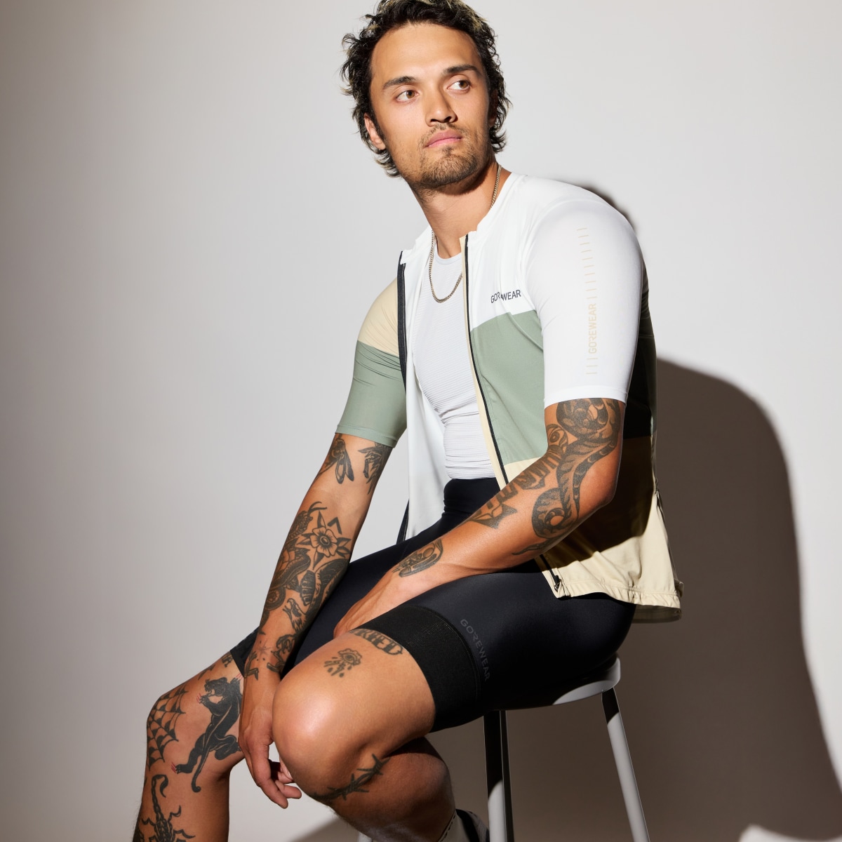 Die eng am Körper anliegende Passform bietet eine verbesserte Feuchtigkeitsregulierung, Wärmeleistung und Aerodynamik. Diese Produkte werden direkt auf der Haut oder über einem enganliegenden Baselayer getragen.