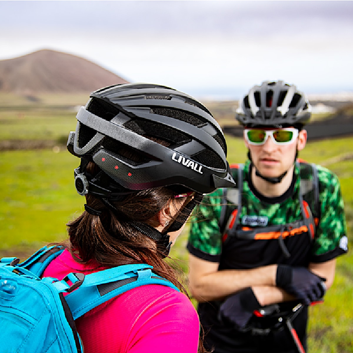 • Bluetooth Verbindung zur kostenlosen Livall App: Anrufe annehmen, Musik abspielen, Walkie-Talkie-Funktion für die Kommunikation in der Gruppe, Rücklichter ein- und ausschalten, SOS Signal verschicken, Touren aufzeichnen und analysieren