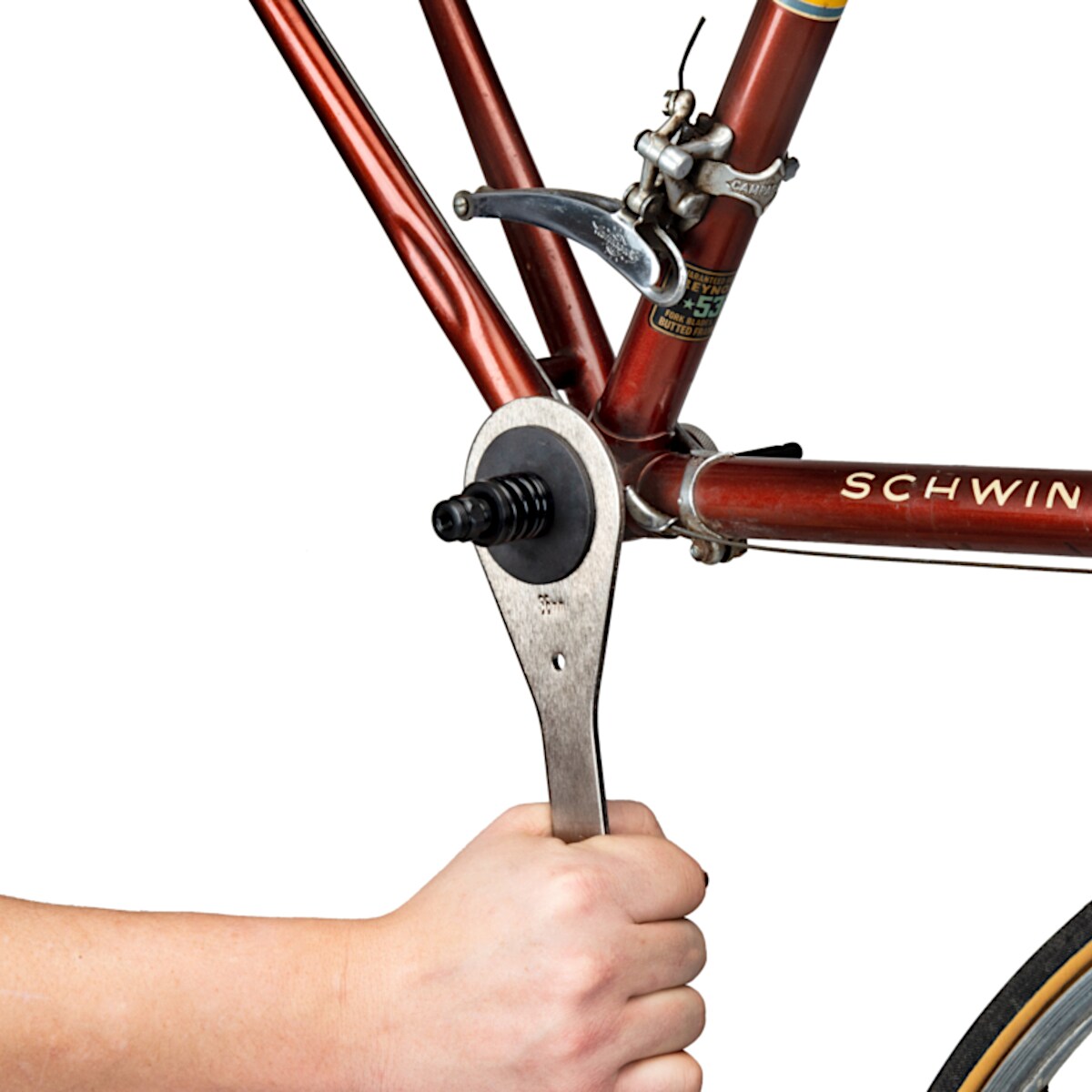 Besser auf Nummer sicher! Beim Verschrauben und Lösen von Tretlagern gewährleistet das BBT-RS Tretlagerwerkzeug-Haltesystem von Park Tool einen abrutschsicheren, festen Sitz deines Lagerwerkzeugs auf den Lagerschalen. Denn obwohl Tretlager bei Montage und Demontage mit hohen Drehmomenten belastet werden, lassen einige Tretlagerschalen nur wenig Platz für den kraftschlüssigen Ansatz des passenden Werkzeugs. Ein Abrutschen kann gefährlich sein und die Lagerverschraubung beschädigen.