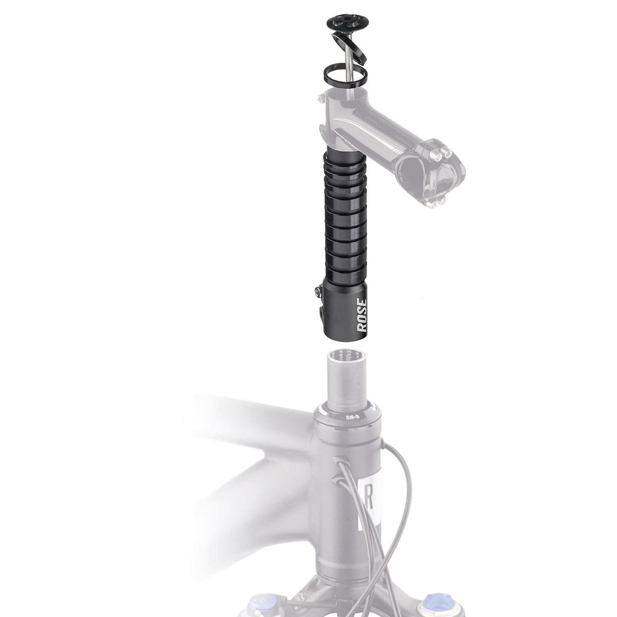 Mit der ROSE Gabelschaftverlängerung kannst du auf einfache Art und Weise deine Lenker-Vorbaukombination auf die gewünschte Fahrposition anheben. Die im Lieferumfang befindlichen Spacer machen die Klemmhöhe des Vorbaus auf dem Adapter variierbar.