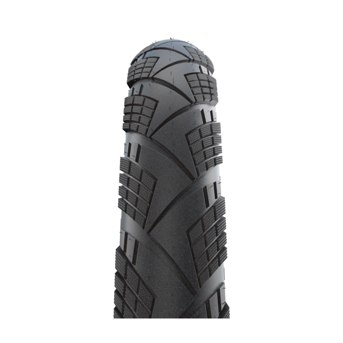 Verantwortlich hierfür ist zum einen das progressiv gezeichnete Profil: Die breite Lauffläche mit Slick im Mittelbereich trifft auf hochgestellte Schulterblöcke mit Diamantprofil, die für Halt in leichtem Gelände sorgen. Zum anderen hat Schwalbe sich beim Karkassenaufbau und der Gummimischung an seinem Rennradreifen-Topmodell PRO ONE orientiert – ohne dabei die klassischen Marathon-Disziplinen außer Acht zu lassen: Laufleistung, Pannenschutz und Alltagstauglichkeit.