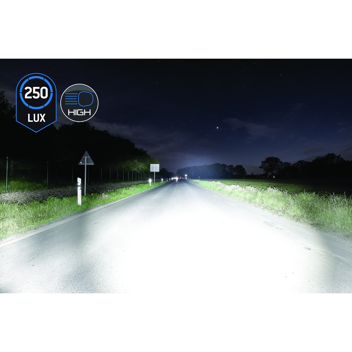 • bis zu 250 Lux Beleuchtungsstärke im Fernlichtmodus (zuschaltbar über Lenkerschalter)