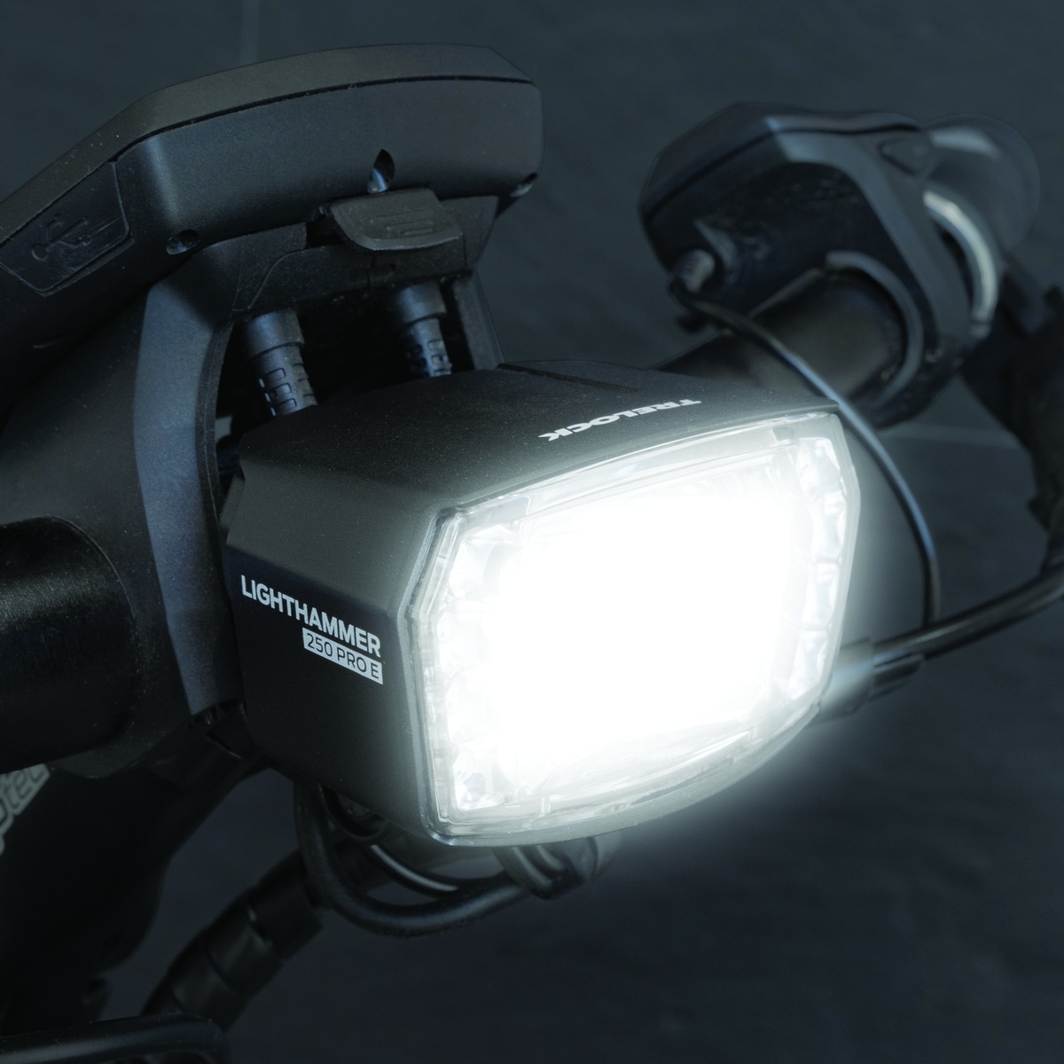 Der LS990 Lighthammer Pro 250 gehört zur Sperrspitze der E-Bike Frontscheinwerfer von Trelock und kann mit einer sehr hohen Beleuchtungsstärke, einem zuschaltbaren Fernlicht und einer sensorgestützten Automatikfunktion für das Tagfahr- und Abblendlicht glänzen.